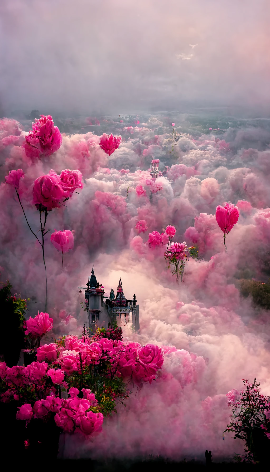 < Garden castle, Many flowers, A few roses, clouds, dramatic clouds above, pink, dreamy ultra wide shot, atmospheric, hyper realistic, 8k, epic composition, cinematic, octane render, artstation landscape vista photography by Carr Clifton & Galen Rowell, 16K resolution, Landscape veduta photo by Dustin Lefevre & tdraw, 8k resolution, detailed landscape painting by Ivan Shishkin, DeviantArt, Flickr, rendered in Enscape, Miyazaki, Nausicaa Ghibli, Breath of The Wild, 4k detailed post processing, artstation, rendering by octane, unreal engine --iw 10 --ar 9:16 --no blue