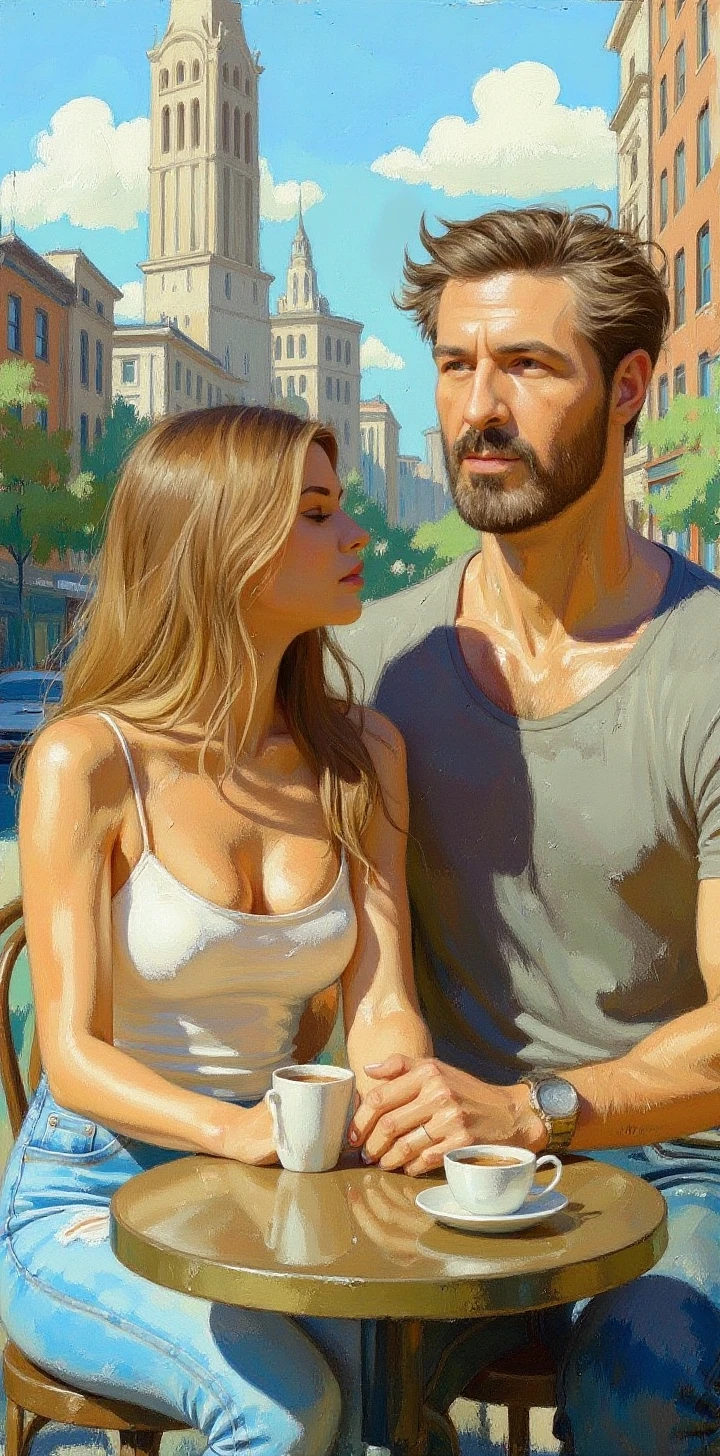 a painting of a woman and her tall handsome husband sitting at a coffee shop in Wallstreet, New York city summer morning , holding hands, drinking coffee , in the style of beautiful women, playfully intricate, heavy impasto, i can't believe how beautiful this is, romantic flair, close-up --ar 1:2 --personalize yruxpc2 --stylize 750 --v 6. 1