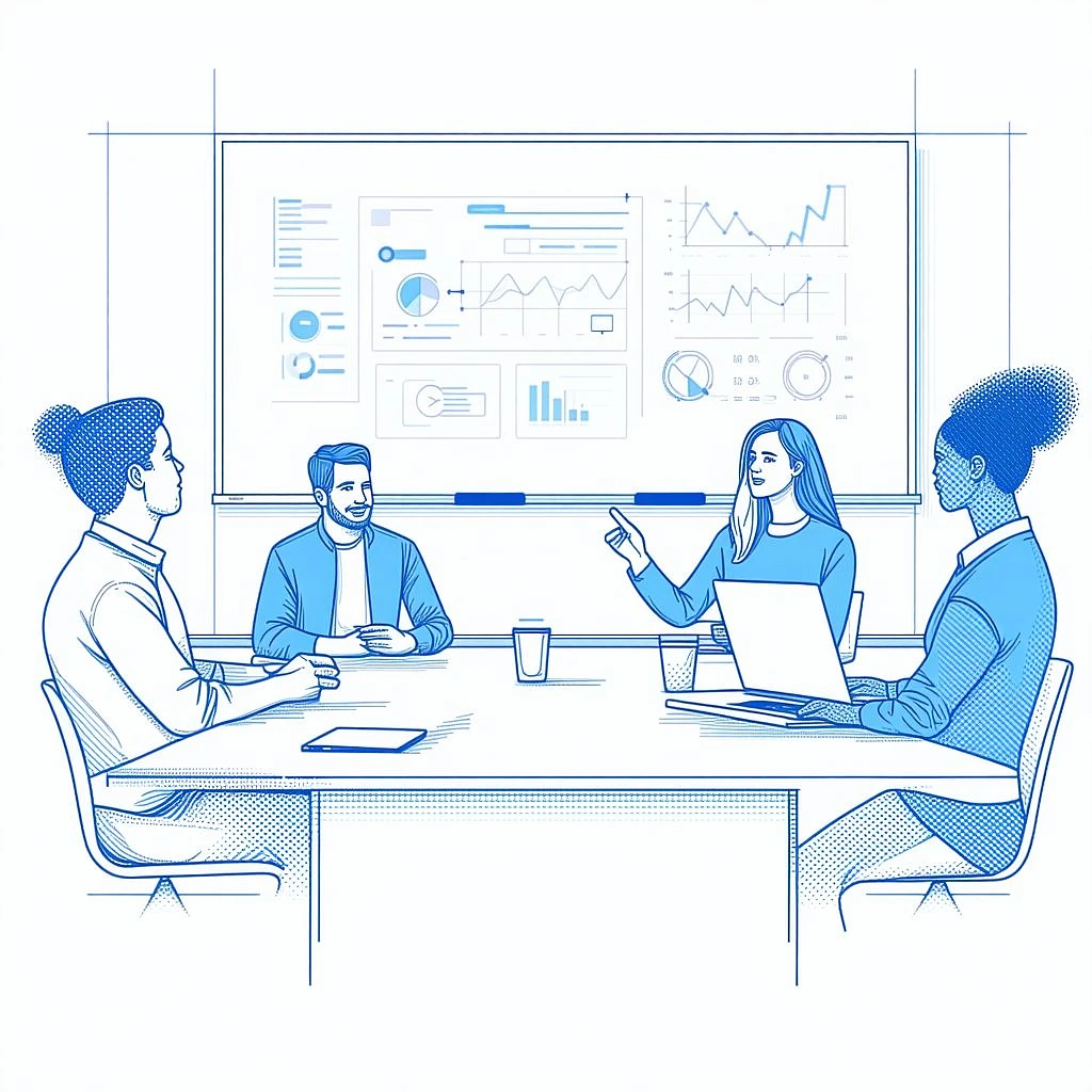 High-resolution illustration, meeting, small group, workshop, work, design thinking, whiteboard, ideation, people talking. , Vector flat graphics. Line work, minimalist, solid background, clean lines, figure outline only, simple line, simple, blue line on white background, no background, clean lines, minimalistic.