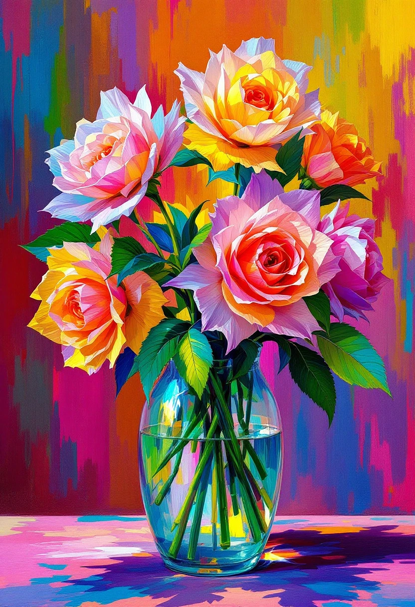 Bright Colors, Bright 3D Transparent Arum Roses, With Few Shiny Leaves In A Vase Rainbow background in the style of Josephine Wall by William Holman Hunt.