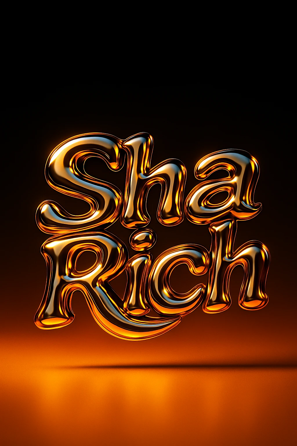 A 3D metallic chrome text logo that says "ShaRich", designed in a fluid, molten style with reflective golden-orange surfaces. The letters have a glossy, liquid metal appearance with highlights and shiny edges. Background is a smooth gradient transitioning from deep black at the top to vibrant orange at the bottom, creating contrast and depth. Ultra-detailed reflections, glowing metallic texture, modern graphic design, bold futuristic typography.