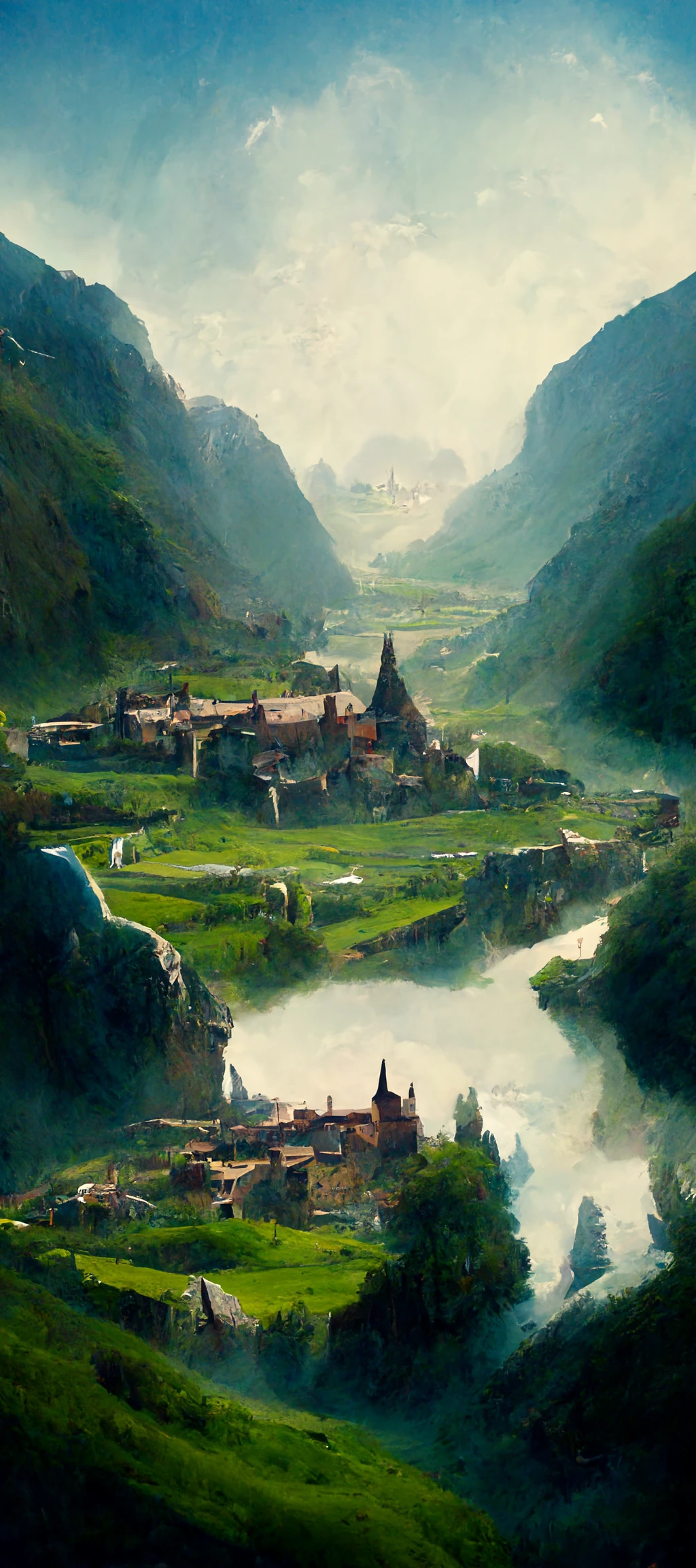peaceful valley with medieval village, in the style of John Howe and Greg Rutkowski, artstation —w 1284 —h 2778 —uplight
