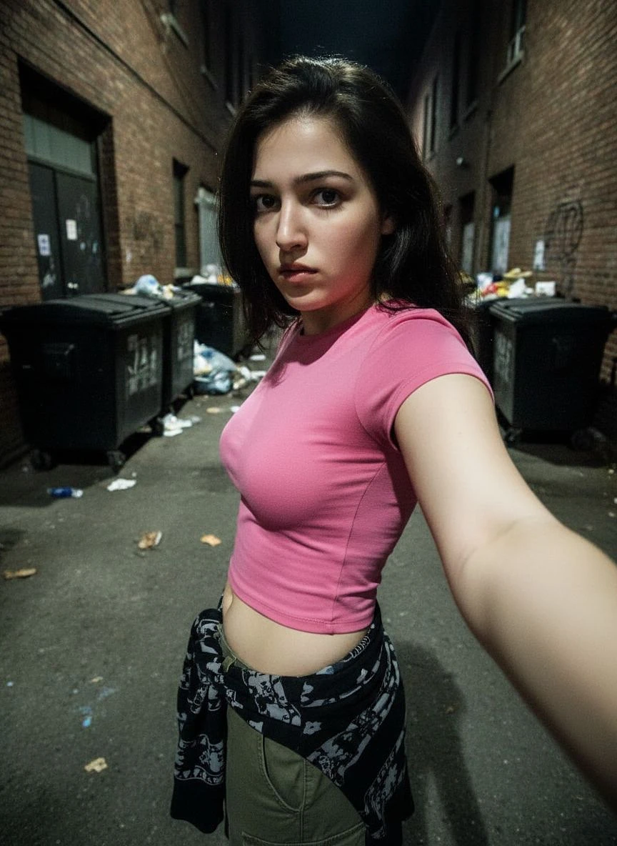 A lo-fi 2010s iPhone selfie ofa casual girl, no clear subject or specific composition—just a casual, unintentional snapshot. the photo evokes a sense of edge, slight touch of blur. flash photography. grainy texture. edited and soft focus, capturing an imperfect moment. closeup low angle candid photographs from behind. (loseup) girl, natural pale skin, freckles, inside a airplane, inside the plane, photo style is amateur, no makeup, standing in alley, view from behind, looking to me, she is looking over shoulder, angry, looking to camera, 'print shirt' oversize olive garco pants, short tight pink tshirt, flat belly.