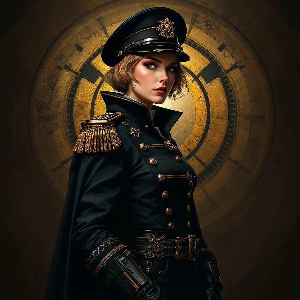 full body, Portrait of a Evanna Lynch in warhammer 40k comissar tunic, short hair, dieselpunk, aristocrat, monograms, max detailing, realism, cogs in the background, gothic 40k circh background, Ian McQue style, Russian empire, British empire, without make-up, Officer Hat, Plasma Pistol, digital painting, dark colors, (artstation) , 8k, intricate details, vintage, retro futuristic style, detailed illustration, side view --q 5 --ar 1:2