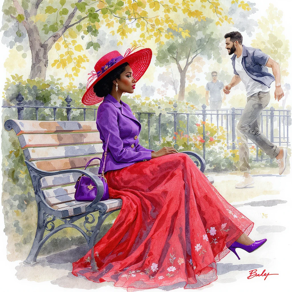 A watercolour painting of a pretty young melanated woman wearing a purple close fitting tailored jacket and a long full red netted skirt with embroidered flowers around the bottom and a large red sun hat with a small flower decoration and purple shoes. The woman is sitting facing forward on a park bench and holding a small purple handbag on her lap. She looks around eagerly as a handsome young melanated man rushes up to meet her.