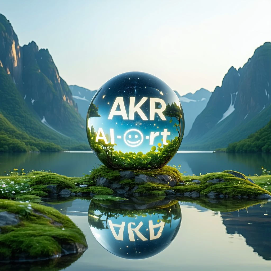Create a symbolic logo for an AI-art studio called "AKR AI-@rt". The written name of the studio should be depicted inside a sphere underlined by an illustrated smile against mountains, lush green and a lake. The sphere is hovering against a bokeh neutral backdrop. The overall aesthetic is a smooth floating transition from a low-poly greyscale pencil drawn sketch to a professional vibrant colorful 8k photography with a high resolution, a high density and an intricately detailed sharp focus.