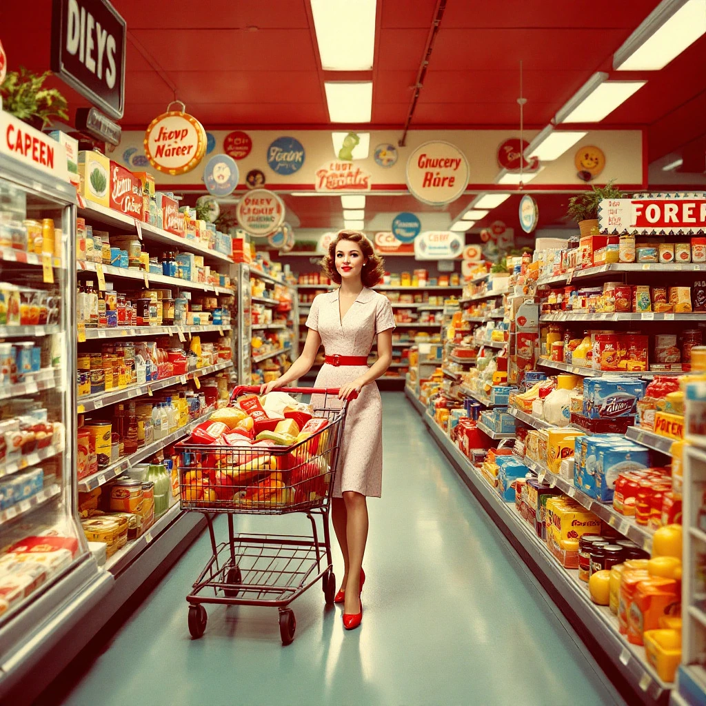 A nostalgic scene set in a 1950s grocery store, featuring a woman elegantly walking down the colorful grocery aisle in a classic 1950s dress. Her outfit showcases the iconic style of the era, complete with a fitted bodice and a full skirt that sways as she moves. She casually pushes a vintage shopping cart, filled with products indicative of the time. The store is adorned with retro signage and aisles overflowing with goods, capturing the charm and vibrancy of mid-century shopping, evoking a sense of nostalgia and warmth.
