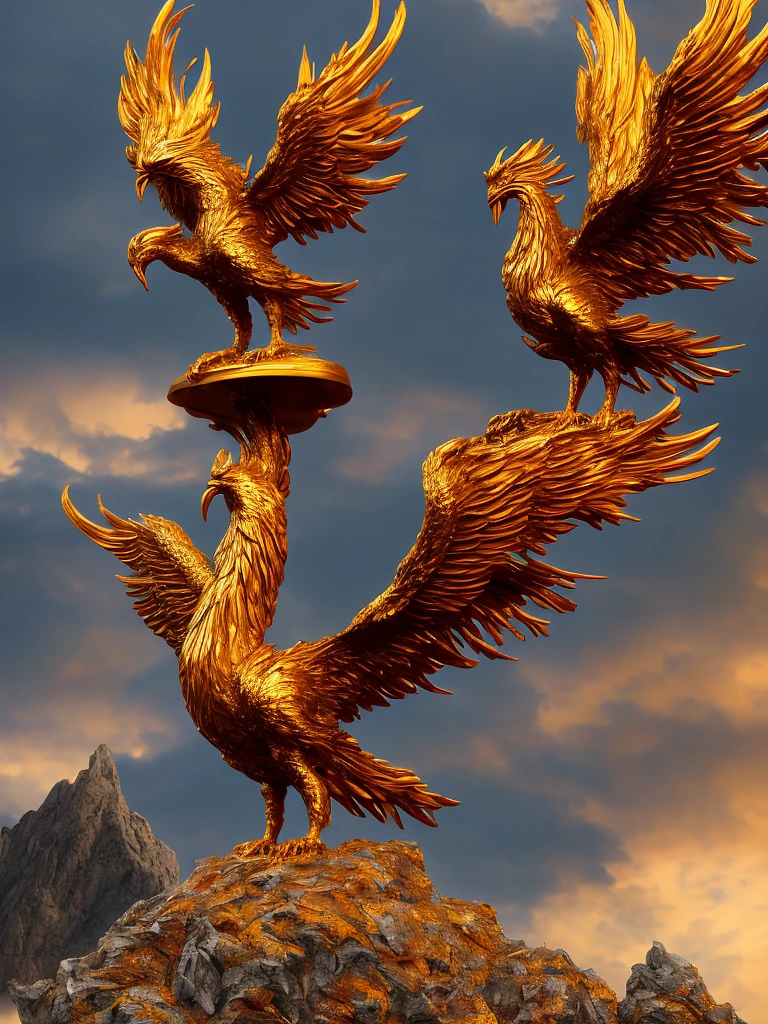 A majestic phoenix with vibrant plumage, its fiery wings spread wide, golden feathers illuminating against a dark sky, perched atop a rugged mountain peak, surrounded by swirling clouds, capturing the phoenix's grace and intensity, Sculpture, bronze casting, 8k high definition --ar 1:1 --v 5