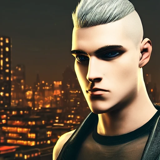 beautiful pale cyberpunk male with heavy black eyeliner, blue eyes, shaved side haircut, hyper detail, cinematic lighting, magic neon, dark red city --ar 9:16 --testp --upbeta
