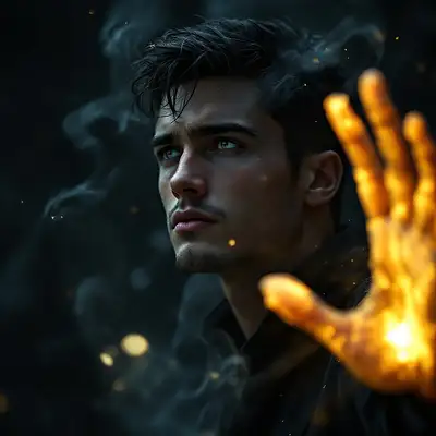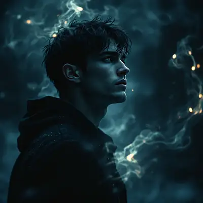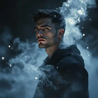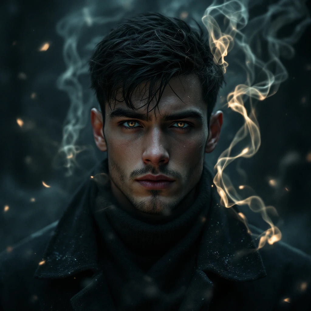 A young man with sharp facial features, short dark hair, and deep, expressive eyes stands alone in dark His chiseled jawline and subtle stubble add to his striking, melancholic expression. His gaze is lost in the distance, haunted by memories of a lost love. Wisps of ethereal mist swirl around him, forming ghostly hands reaching out before dissolving into the cold night air. glow on his face, emphasizing his loneliness and regret. , enhancing the cinematic, dreamlike atmosphere. The background dark blurred as if seen through teary eyes. The image is highly photorealistic, with intricate details in skin texture, lighting, and atmospheric depth, evoking deep emotion