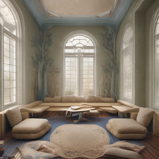 High resolution photography interior design, dreamy sunken living room conversation pit, wooden floor, small windows opening onto the garden, bauhaus furniture and decoration, high ceiling, beige blue salmon pastel palette, interior design magazine, cozy atmosphere; 8k, intricate detail, photorealistic, realistic light, wide angle, kinkfolk photography, A+D architecture