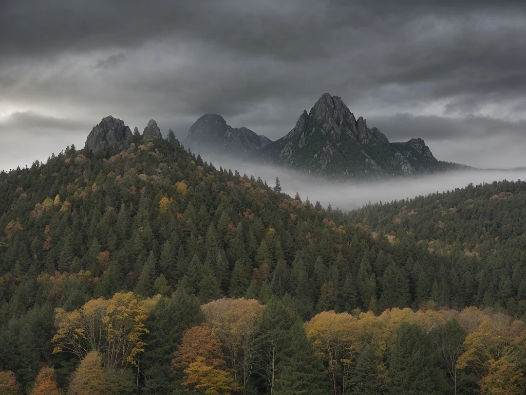 Dense foliage with varied tree species, including deciduous and evergreen trees, creates a vibrant and textured landscape. Towering mountains rise in the background, their rugged peaks shrouded in mist and cloud. A deep, foreboding grey sky with swirling clouds adds drama and tension. Soft, warm, golden light illuminates the scene, casting long shadows and emphasizing texture. Wide-angle, capturing the expansive landscape and creating depth. Dreamlike, ethereal, and enchanting, evoking a sense of wonder. Mist and cloud add mystery and depth to the image.