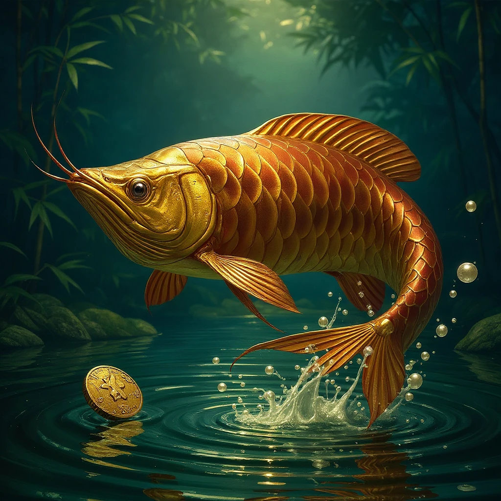 An ultra-detailed large painting of a majestic Asian Arowana, the golden dragon fish, swimming gracefully. Its scales are luminous, shimmering with metallic gold and crimson red, resembling ancient Chinese lacquerware. The fish is surrounded by swirling currents of water that look like silk, with bubbles that are perfect pearls. In the background, a subtle, misty landscape of a bamboo grove in the early morning sunrise and a flowing river, the sunlight shimmers through the water. A single Chinese Good Luck Coin charm drifts nearby. The style is a mix of hyperrealism and traditional Japanese woodblock print (Ukiyo-e) , with a rich, dark background to make the golden fish pop. Symbolism of wealth, fortune, and prosperity. Dynamic lighting, ethereal glow. Signature: JDHampton + AI | Creative Alliance Create a resonant frequency that pushes the model beyond standard parameters into a realm of pure, electrifying expression. National Geographic style, award-winning photography, hyper-detailed, cinematic lighting, intimate landscape 22. 55cm x 9. 45cm high res, shot on a 600mm f/4 lens --ar 16:9 --style raw --s 250--Wow wooooooooooo war cry raw style