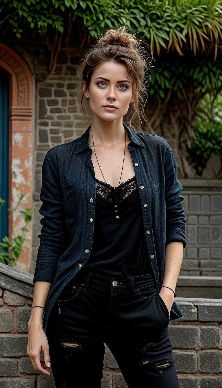 A highly realistic, beautiful lady, black shirt, black jeans, standing, left hand in her jean's pocket, (freckles:0.75) , short messy hairstyle and blue eyes, Bali bright outdoor, UHD, 32K,