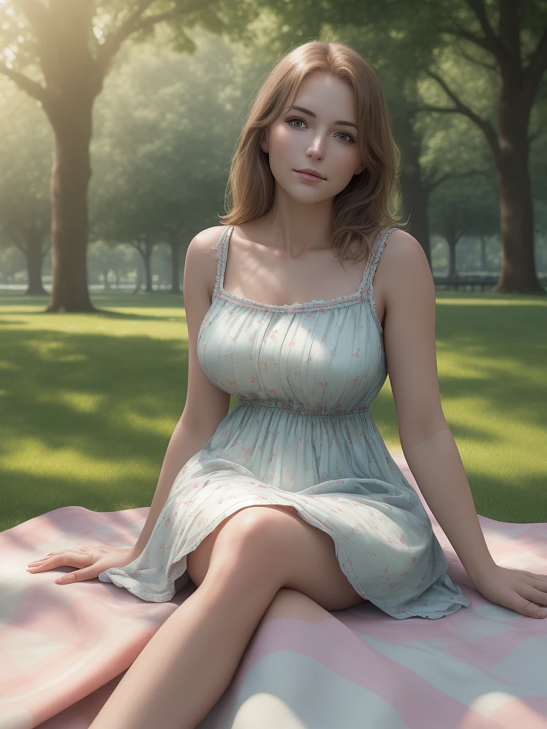 high-resolution photo of a beautiful woman wearing a summer dress sitting on a blanket in a park, photorealistic, UHD, shot on a Sony A7III, optimal photography, natural lighting HDR-RAW image