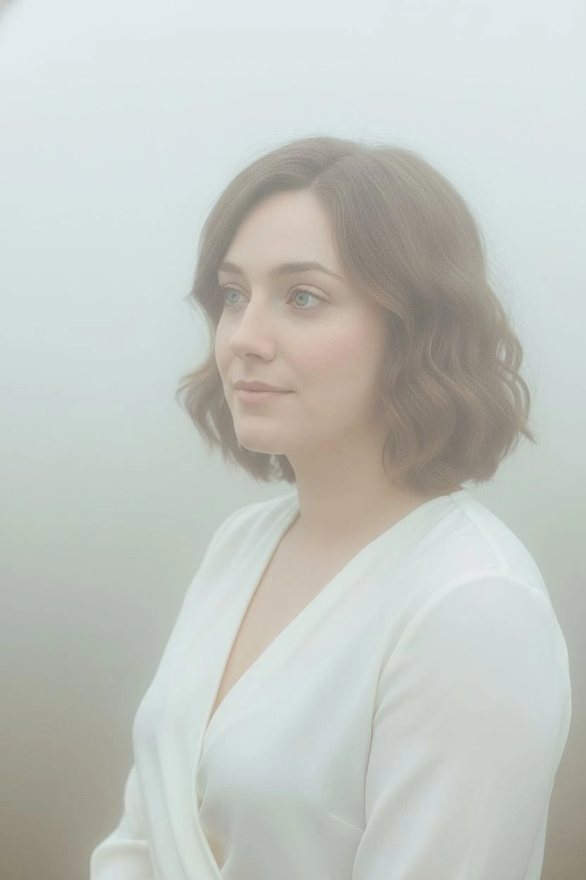 Fine art photograph. Close up portrait of the uploaded woman, graceful and elegant, white shirt, subtle makeup, not looking at the camera, amidst thick fog. Soft pastel colours, low visibility. Modernist aesthetic, soft contrast, gentle and soothing. Professional photography.