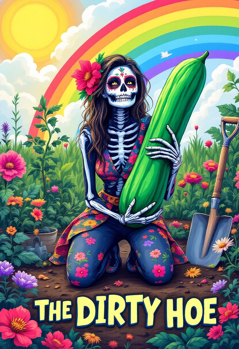 An illustration of a colorful skeleton woman kneeling in a vibrant garden, holding a large cucumber playfully. She has intricate face paint and wears stylish clothing with floral patterns. Surrounding her are various gardening tools like a shovel and blooming flowers, with a bright rainbow in the background. The text 'THE DIRTY HOE' is featured prominently at the bottom in a fun, bold font. The overall design is whimsical and cheeky, celebrating gardening and playful humor