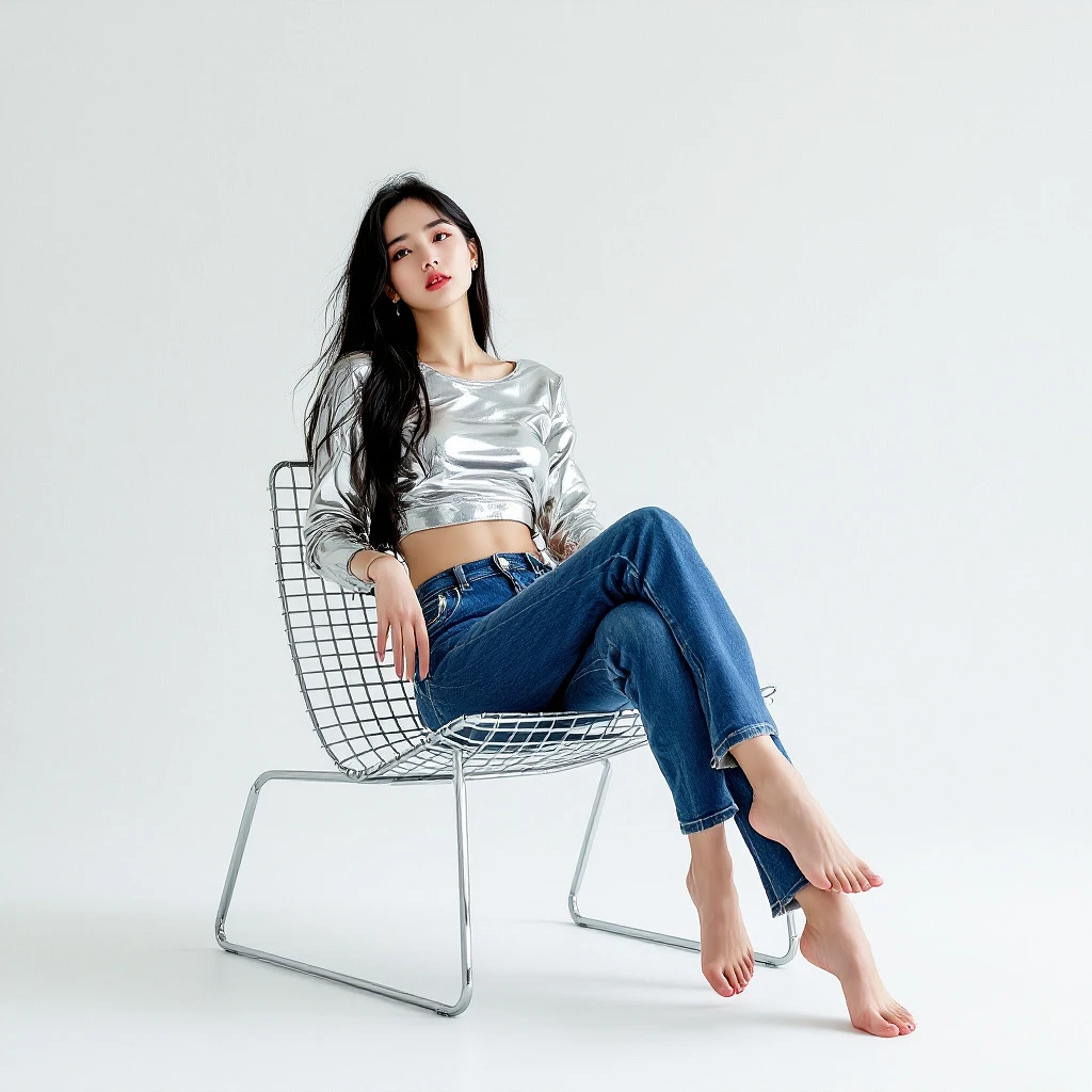 create an image of a young korean woman model with long black hair, captured in a striking and contemporary photo-shoot within a minimalist setting, lounging in an architectural, matte silver metal chair designed with a bold, linear frame, model is elegantly dressed in a silver chrome top and blue jeans, her posture straight yet filled with intention, her legs casually not crossed, her arms resting loosely along the top, and her head tilted slightly front, giving a sense of ease and confidence, background is a plain, bright white, highlighting the stark contrast between the chair's rigid structure and her soft, fluid pose, lighting is soft and diffused, casting gentle shadows that sculpt her features and the textures of her attire --ar 1:1 --style raw