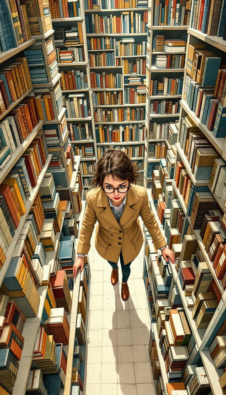 7. A whimsical, full-body scene of a woman navigating a labyrinthine library, her small form surrounded by towering shelves of books. She wears a tweed jacket, spectacles perched on her nose, and her expression is one of intense concentration. The perspective is from above, emphasizing the vastness of her task. The art is inspired by the detailed architectural drawings of M. C. Escher and the narrative charm of children's book illustrations.