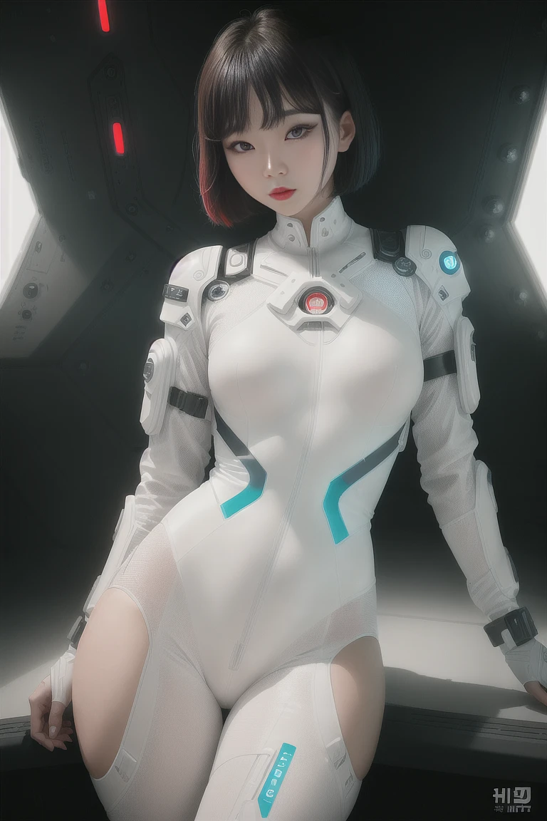 (1girl) , (full body) , (white futuristic sci-fi bodysuit) , Beautiful Korean woman, kpop idol, (Cute Loose Bob hairstyle) , symmetrical eyes, realistic, sharp focus, HD, highly detailed, intricate, photography, hyperrealism, hyperrealistic, film, studio portrait, detail, dramatic lighting, (red lips) , (small breasts)