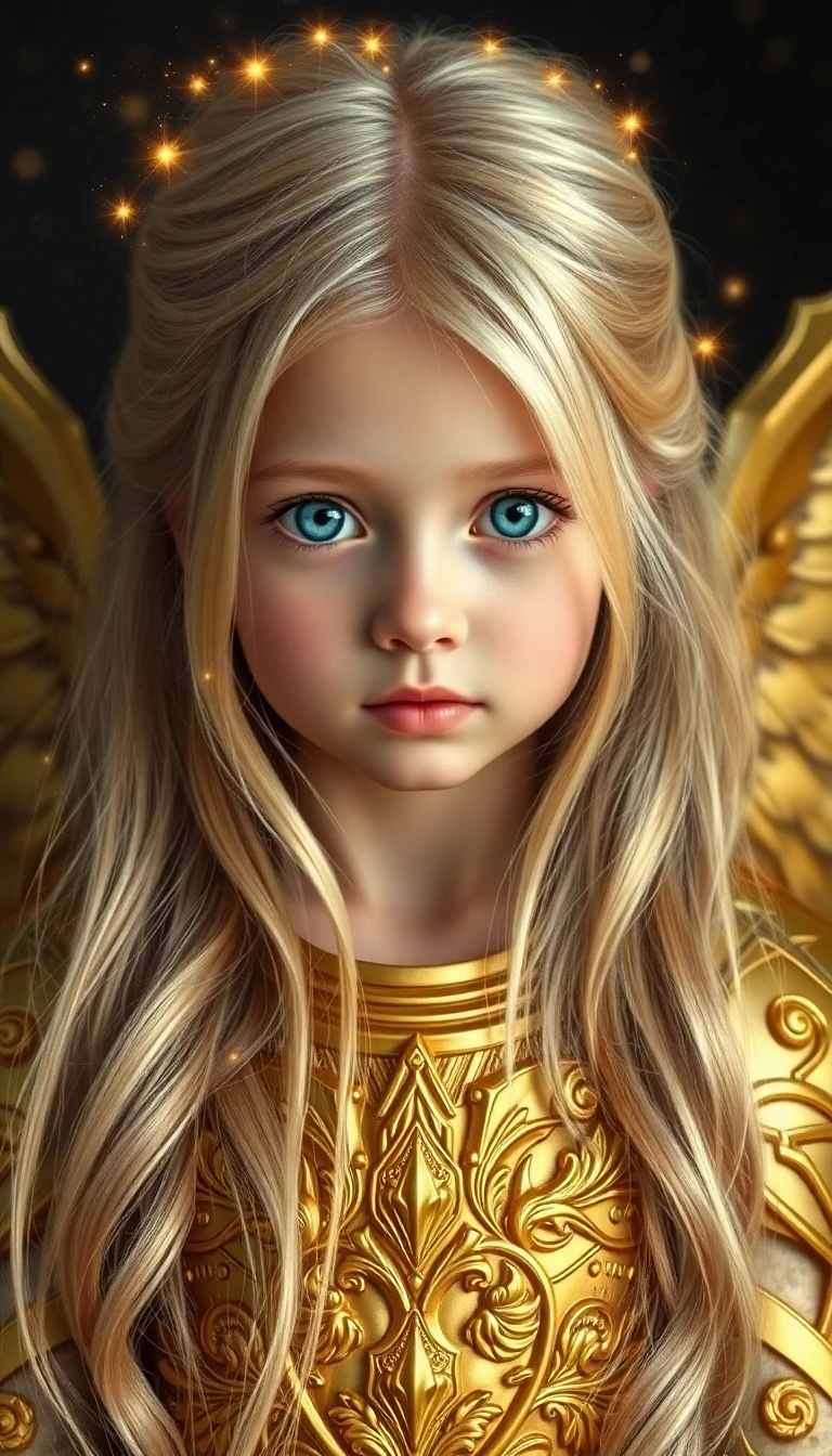 a professional photo of a exceptionally of the most beautiful girl (age 7) in the world with platinum very long dark blonde hair, (masterpiece) , (realistic) , (Full body) brilliant blue eyes golden armor, shimmering little sparks around her, large golden eyes, big angel wings with ornaments, high resolution (8k) , (high res) , ultra-detailed, photo-realistic, front view, highly detailed, volumetric, dramatic light Perfect graphics, ultra-detailed, photo-realistic, full image view, full body view, front view