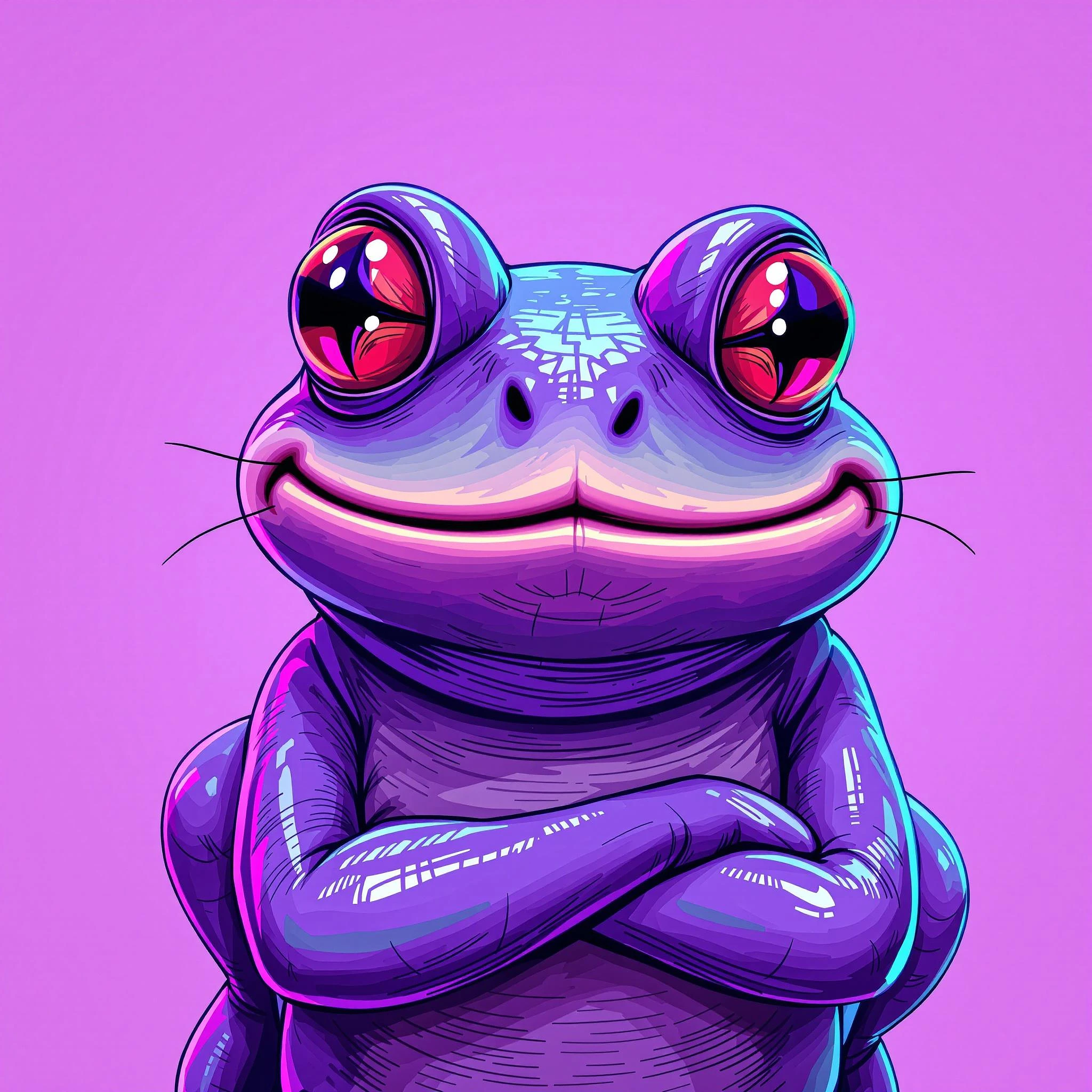 A humorous and meme-style NFT profile picture featuring a smug, anthropomorphic purple frog character, inspired by internet culture. The character cosplay lisa blackpink and a clean cartoon aesthetic. The background is a simple pastel or neon purple gradient