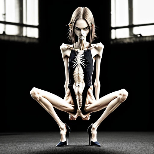 squatting position of extreme skinny slender anorexic girl very skinny slender girl, with long curved claws, skinny legs and long skinny calves in high heels,