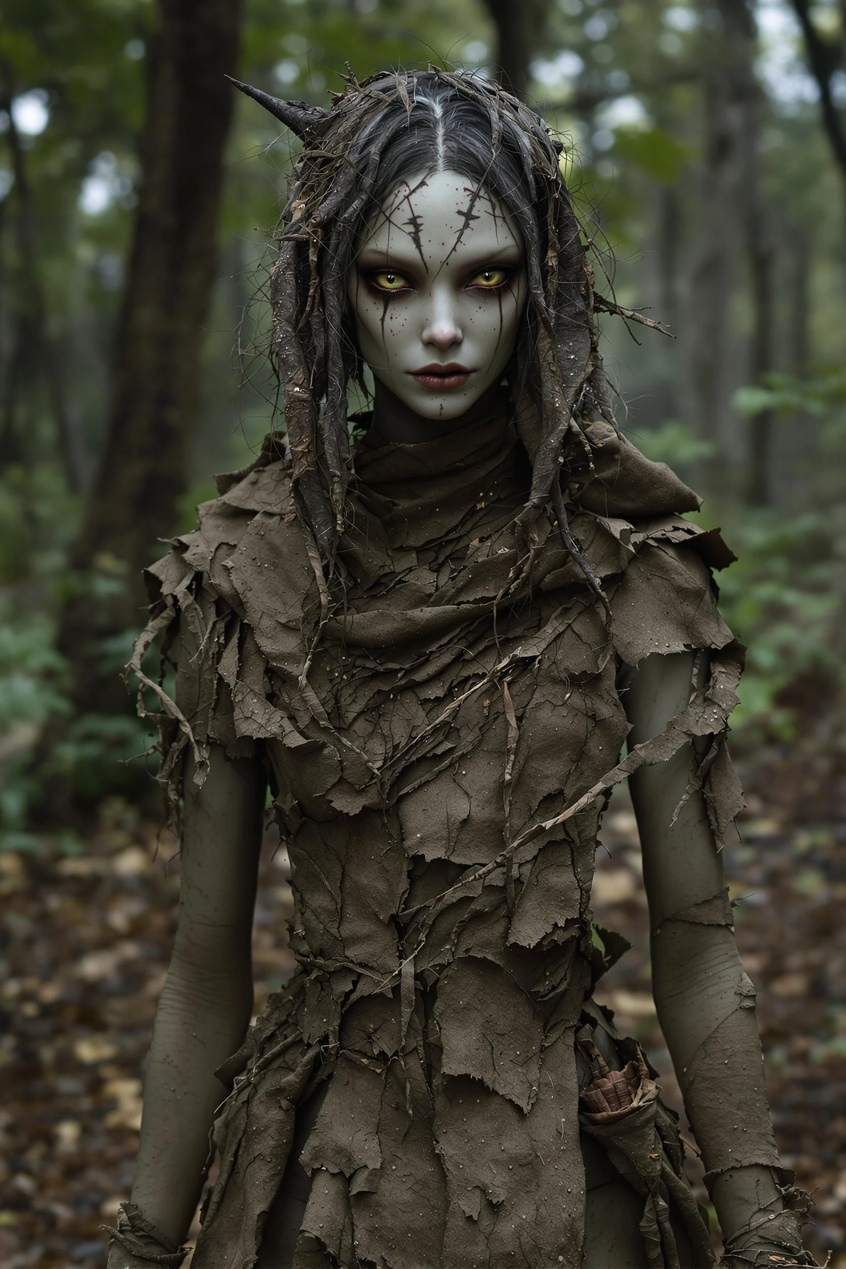 25 year old slender girl, photo of a seductive banshee druid, hyper detail, intimate facial expression, handcrafted tattered mud outfit, woodland background, dramatic cinematic lighting, concept art, unreal engine 5, RTX, ray tracing, photorealistic