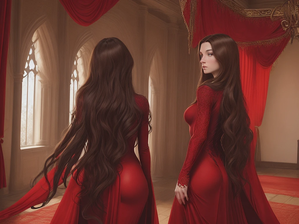 The woman stands confidently in front of a grand, red curtain that hangs from the ceiling of a medieval castle. Her long, wavy brown hair cascades down her back, framing her face and adding to her elegant demeanor. She wears a black, long-sleeved bodysuit made of a luxurious material that catches the light. The bodysuit features an intricate, chain-like design across the chest and abdomen, adding a touch of sophistication to the overall design. The background of the image is dominated by the grand, red curtain, which adds a sense of drama and luxury to the scene. The curtain is made of a thick, velvety material that catches the light, giving the image a sense of depth and texture. The overall effect is one of elegance and refinement, as if the woman is posing in a lavish medieval castle.