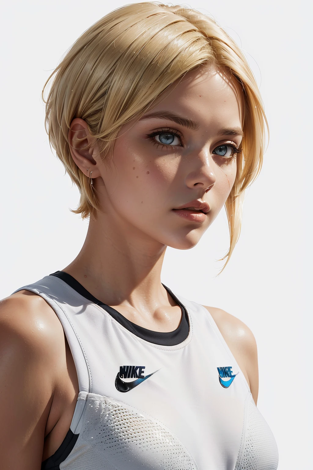 (8k,ultra hd,high resolution,extreme detail,octane,render,best quality,masterpiece,dynamic angle, highest detailed:1.2) , 1girl, (intense blonde short hair:1.2) , beautiful eyes, wearing sports wear, fit body, (nike logo:1.2) , (white sneakers:1.2) , looking at viewer, (abstract background:1.2) , (ultra high resolution textures:1.2) , (official art:1.2)