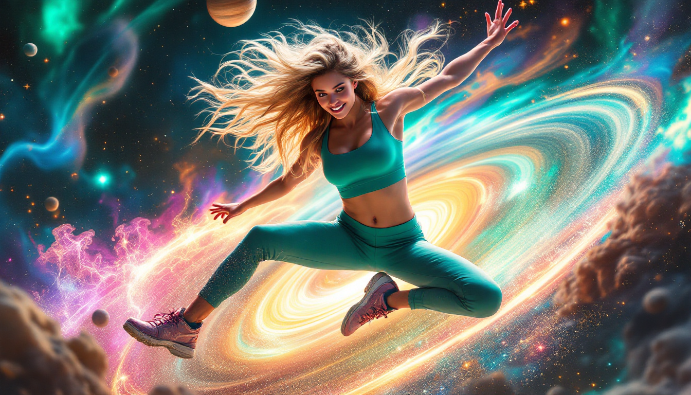 A Stunning young woman, light-skinned, likely in her late teens or early twenties, is depicted in a dynamic breakdancing pose, mid-air. Her expression is energetic and focused, with a slight smile hinting at exhilaration. Long, vibrant blonde hair flows around her, styled in a way that seems to interact with the energetic abstract elements surrounding her. She wears a light teal-green, form-fitting crop top and matching pants, creating a sleek, athletic look. The outfit material appears smooth. The background is a mesmerizing blend of celestial elements, including glowing, swirling nebulae, vibrant colors, and a stylized depiction of space. Planets with rings are subtly integrated into the design. The overall composition features a strong sense of motion and dynamism, with swirling light trails and ethereal effects radiating outwards from the central figure. Vivid and saturated colors, including electric blues, pinks, and greens, dominate the scene, creating a vibrant, energetic atmosphere. The lighting is diffused, emphasizing the subject and the surroundings with a glowing effect. The texture appears smooth and fluid, with a combination of abstract digital painting effects and smooth gradient elements. A text overlay, "waves of change," in a light rose gold script, is prominently placed in the bottom section of the image. The artwork exhibits a blend of abstract expressionism and futuristic visual elements, aiming to convey a feeling of change and transformation. The artwork's style blends digital painting with a futuristic aesthetic. The perspective is a dynamic overhead, capturing the essence of the dancer’s motion in midair.