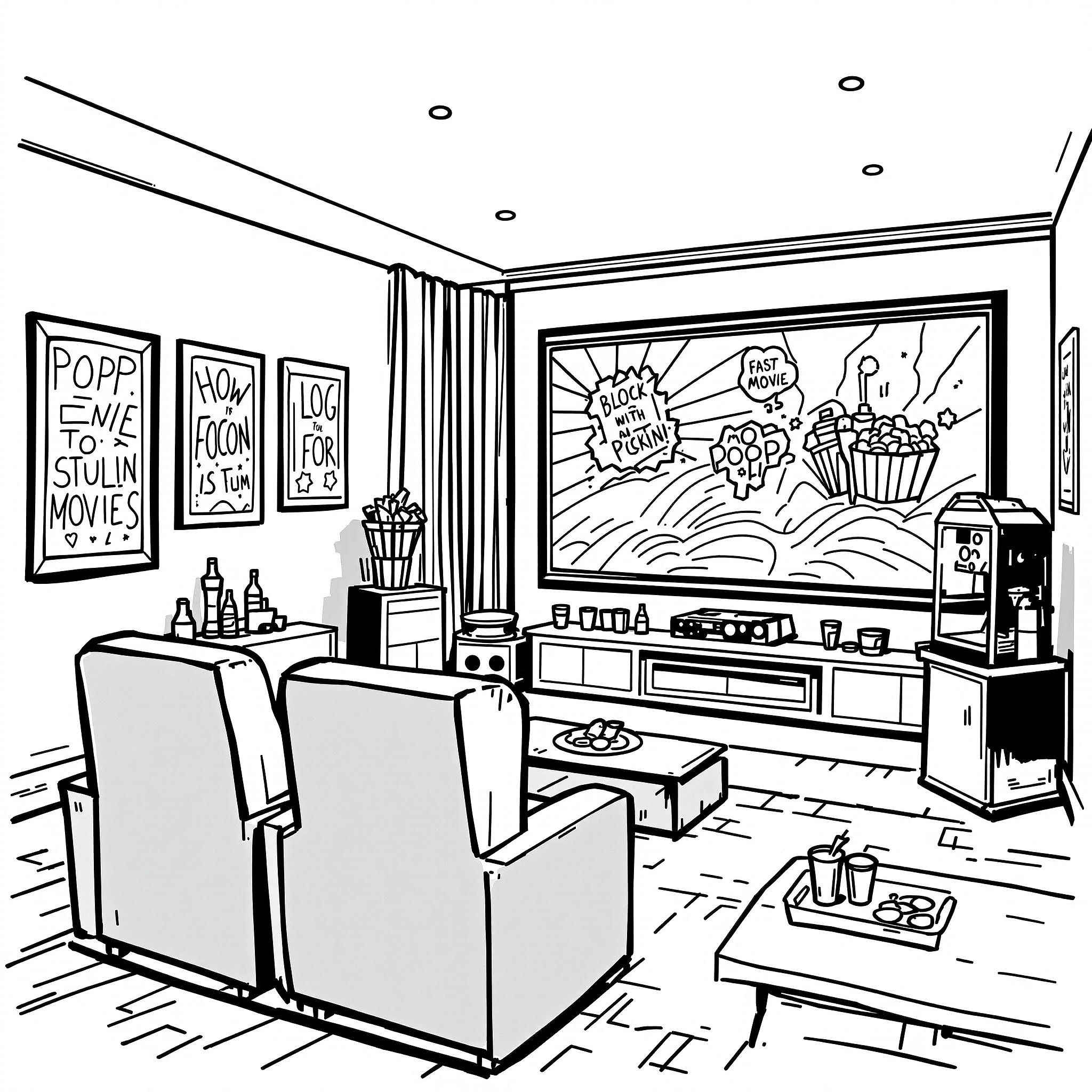 High-resolution black-and-white line drawing of a home theater: Include detailed elements such as a big screen with a movie playing, comfy chairs or sofas, a popcorn machine, movie posters on the walls, and a table with snacks and drinks. Ensure the drawing is in a style suitable for coloring, with clear lines and no filled-in black areas.