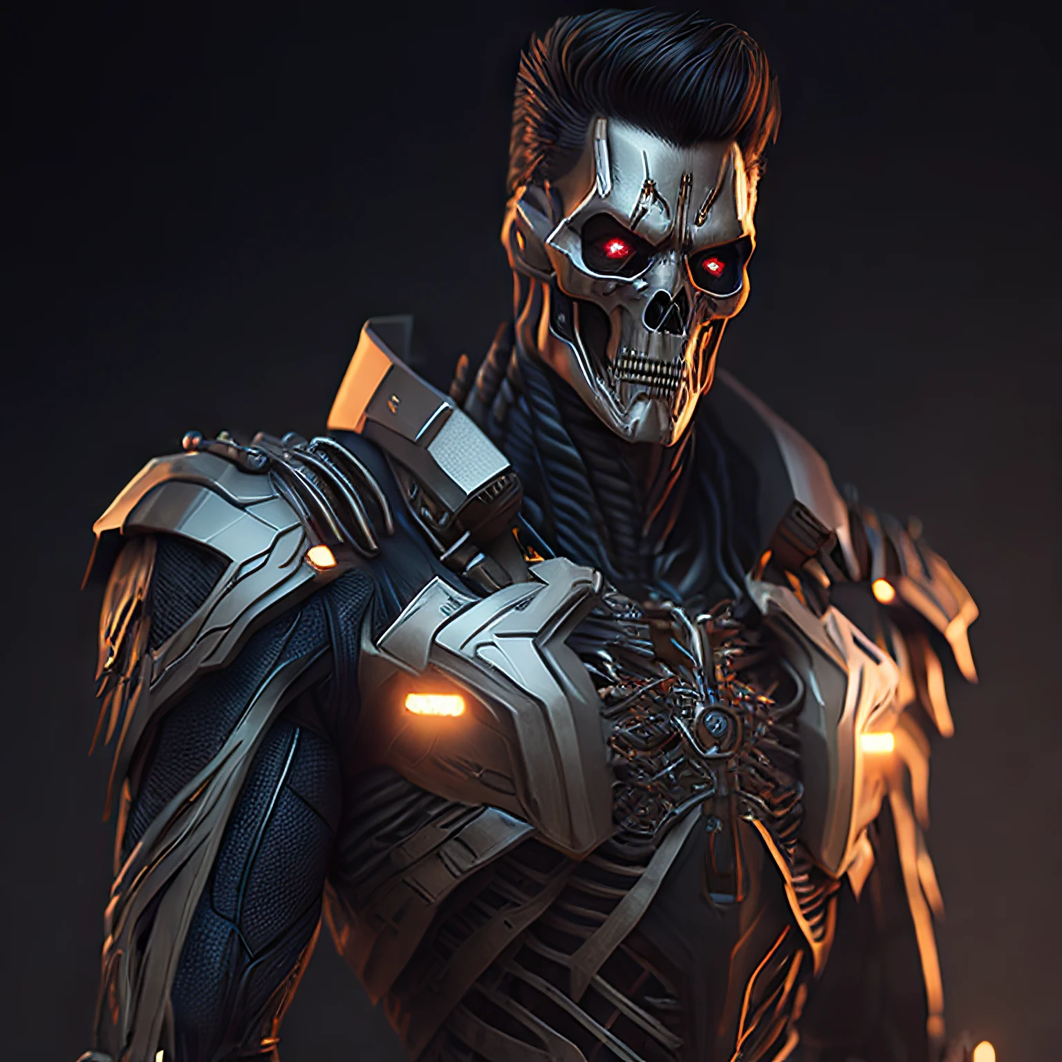 close up of a t-800 dressed as Elvis with glowing eyes| cgsociety| digital art| terminator skeleton| anger| hyper detailed
