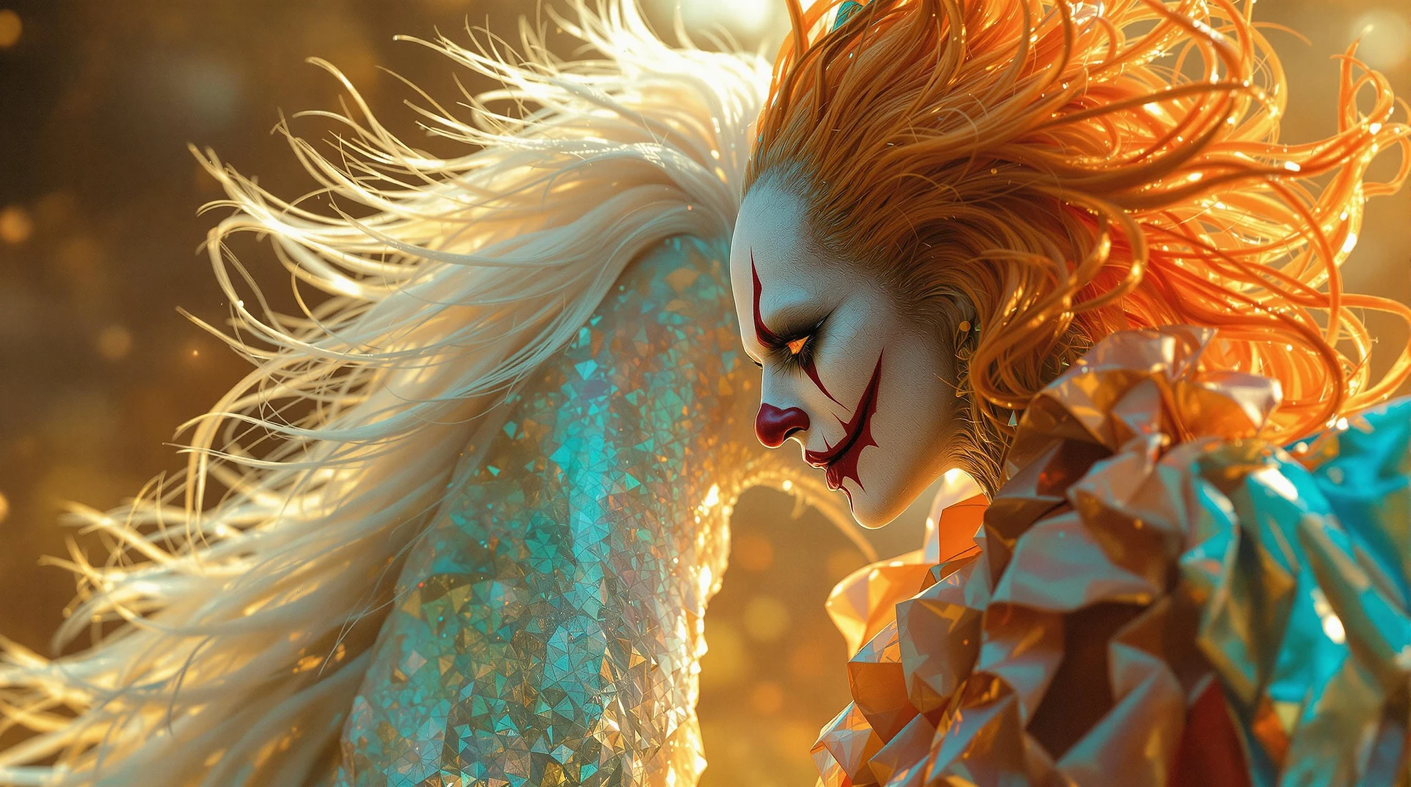 A grand fiction close-up scene in a horror movie poster style, featuring a right-side view of an harlequin evil clown, hyper-realistic and professionally rendered in 3D, depicting the maleficant clown , The detailed, bizzard dressed horse is rendered in stunning hyper-reality, with pale skin, sharp features, and white and colored iridescent clothing that contrasts with warm terracotta and cool teal tones. Their fine and silky hair flows in the wind as their outfitsr glows with a soft, ethereal light, as if kissed by the sunshine. The lighting is dramatic, with rich textures and a sense of heroic scale and grandeur. The overall aesthetic is one of high-quality, cinematic 3D rendering, evoking a sense of epic drama and fantasy