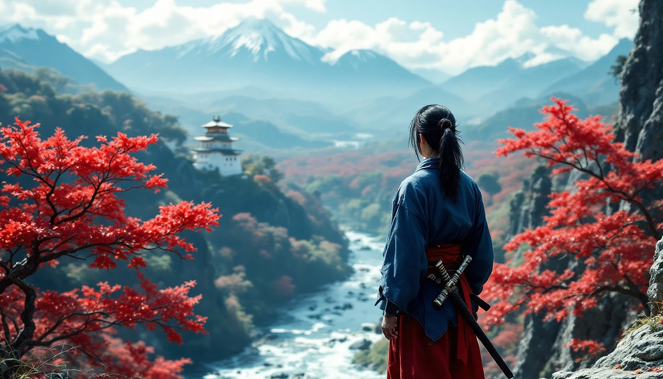 a lone samurai standing on a rocky outcropping, gazing out at a breathtaking landscape. The samurai has black hair tied back in a ponytail, with a few loose strands framing his face. He wears a blue kimono with a red sash and red pants, with a sword at his side and a scabbard on his back. The background features a serene landscape with red trees, a stream, and mountains in the distance. A white structure resembling a castle or temple is visible in the distance, with a blue sky above. The wide-angle camera perspective captures the expansive scenery, with the samurai at the forefront.