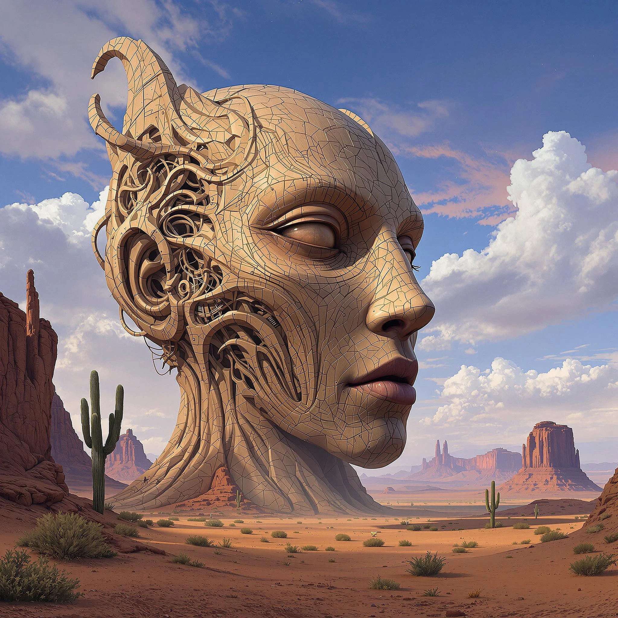 large humanoid face with detailed and complex facial in the desert, a fantasy landscape in the style of Jim Burns. Surrealism, Dynamic Epic, I can’t believe how beautiful this is --ar 1:2 --stylize 750