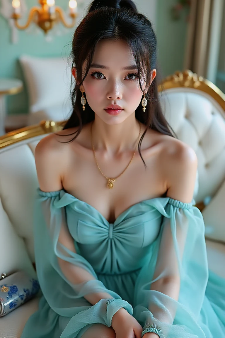 The image is a portrait of a young woman with long dark hair styled in a half-up, half-down ponytail, and brown eyes, wearing a light blue off-the-shoulder dress with sheer sleeves and a plunging neckline, adorned with a gold necklace and dangling earrings. She is looking directly at the camera with a neutral expression. The background is blurred, but it appears to be an indoor setting with a beige couch and a blurred blurred background of people in the distance. In the bottom left corner of the image, there is a silver clutch purse with a floral pattern.