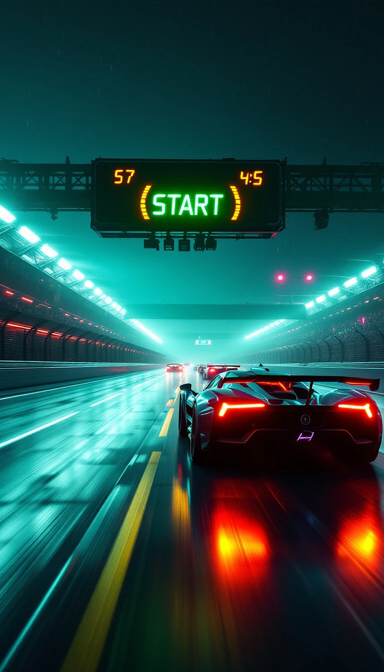 The start sounds, and the green light turns on on the scoreboard hanging above the track in front of the racing cars. Cars take off. The camera follows a bright car, Style - cyberpunk