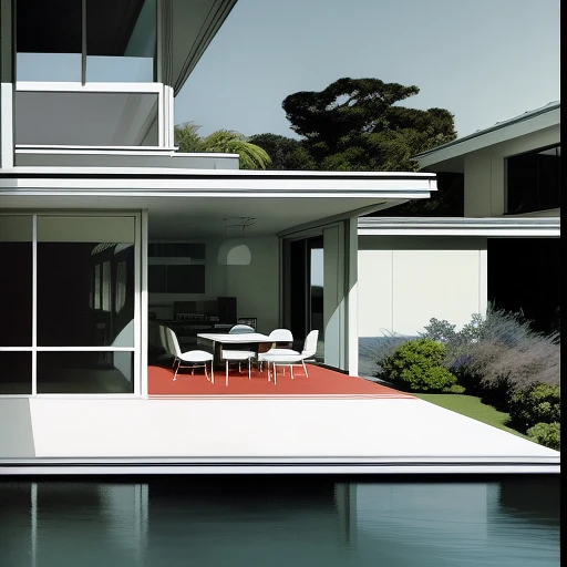 Hyper realistic eye level exterior photo of a mid century modern style house overlooking the ocean, daylight, indirect lighting, AD magazine, Frank Lloyd, Eames, Mies van der Rohe