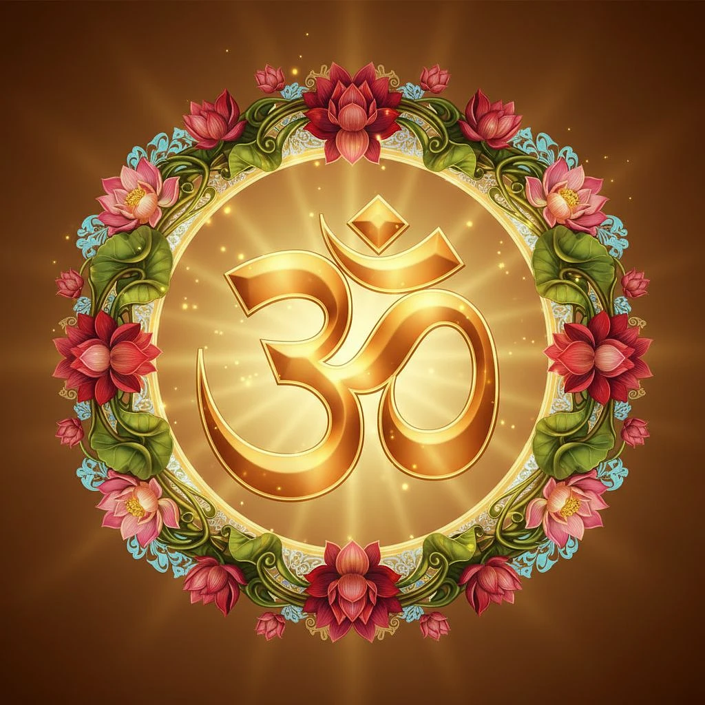 The central symbol is a golden sign "ॐ (Om) ", made in 3D volume with soft highlights, shine and polished metal effect. The palette is warm gold and amber shades, complemented by rich accents (pink and scarlet flowers, green leaves, light blue tints) . Ornamentation - around the symbol there is a rich frame of flowers (lotuses) , decorative elements, patterns, glowing particles. Everything is made with high detail. The effect of radiance is a feeling of divine light emanating from the center, with soft gradients and backlighting. The background smoothly transitions from dark gold to bright light. The atmosphere is solemn, spiritual, mystical. Visually it looks like a combination of Eastern sacred art with modern digital art. The style can be called digital fantasy art / sacred art, with elements of 3D rendering, hyperrealism and decorative illustration.