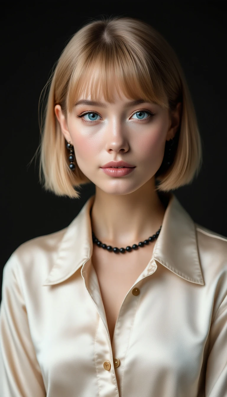 "Image is a high resolution portrait photograph featuring a model with a neutral, dark background. She has a fair complexion and striking blue eyes, which are accentuated by subtle makeup. Her hair is a sleek, straight bob with bangs, coloured in a light honey blonde shade. She is wearing a cream silk blouse with a classic collar, and a simple black pearl necklace and earrings that adds a touch of elegance. The lighting is soft, highlighting her facial features and creating a smooth, even tone across her skin. The overall composition is centred, with the subject making direct eye contact with the camera, conveying a sense of confidence and poise. "