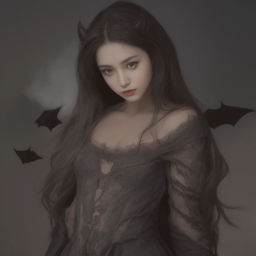 a woman with long, dark hair and horns, wearing a brown dress, set against a dark, smoky background with bats flying around her. - Her hair is long and dark, with loose waves framing her face. - Her attire consists of a brown dress that complements her dark hair and horns. - The background is dark and smoky, with bats flying around her, adding to the eerie atmosphere. - The lighting is dim, with a full moon shining behind her, casting an ethereal glow. - The camera perspective is from below, looking up at the woman, emphasizing her powerful presence. - The style is fantasy art, with a focus on dramatic lighting and bold colors. - The camera used is likely a digital SLR or mirrorless camera, with a wide-angle lens to capture the expansive background.