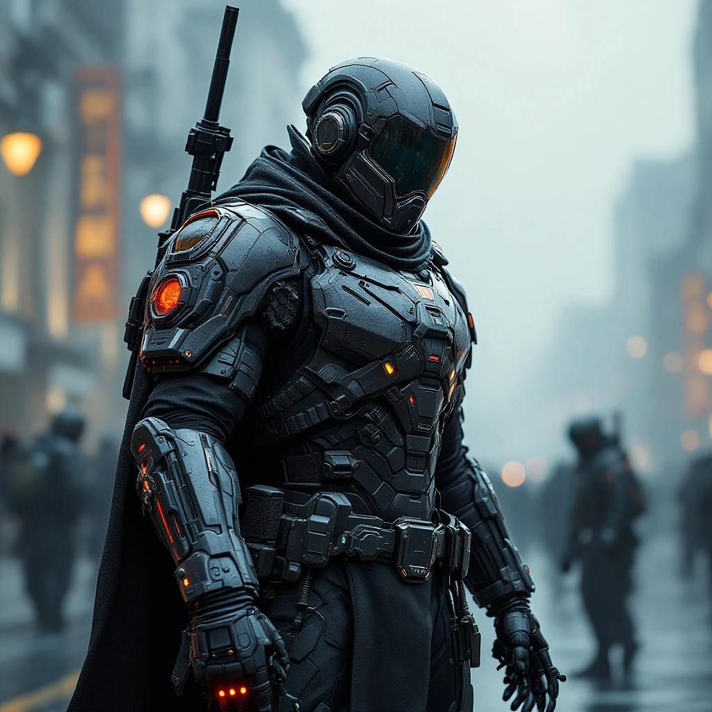 Full battle armored futuristic soldier with advanced weapons and accessories, street, overcast, reflection mapping, intricate design and details, dramatic lighting, hyperrealism, photorealistic, cinematic, 8k, unreal engine --ar 9:16 --s 750