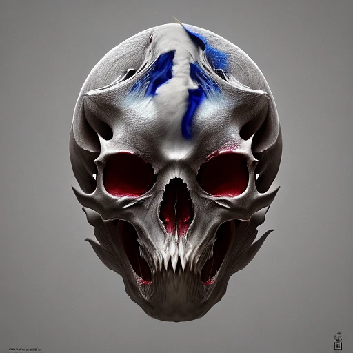 dragon skull, red blue and black and white colors, 8k, hyperrealistic render, 3D sculpture, artstation, Feng Zhu, James Jean, haunting, horror, matte painting, CGI, digital painting, detail, atmosphere