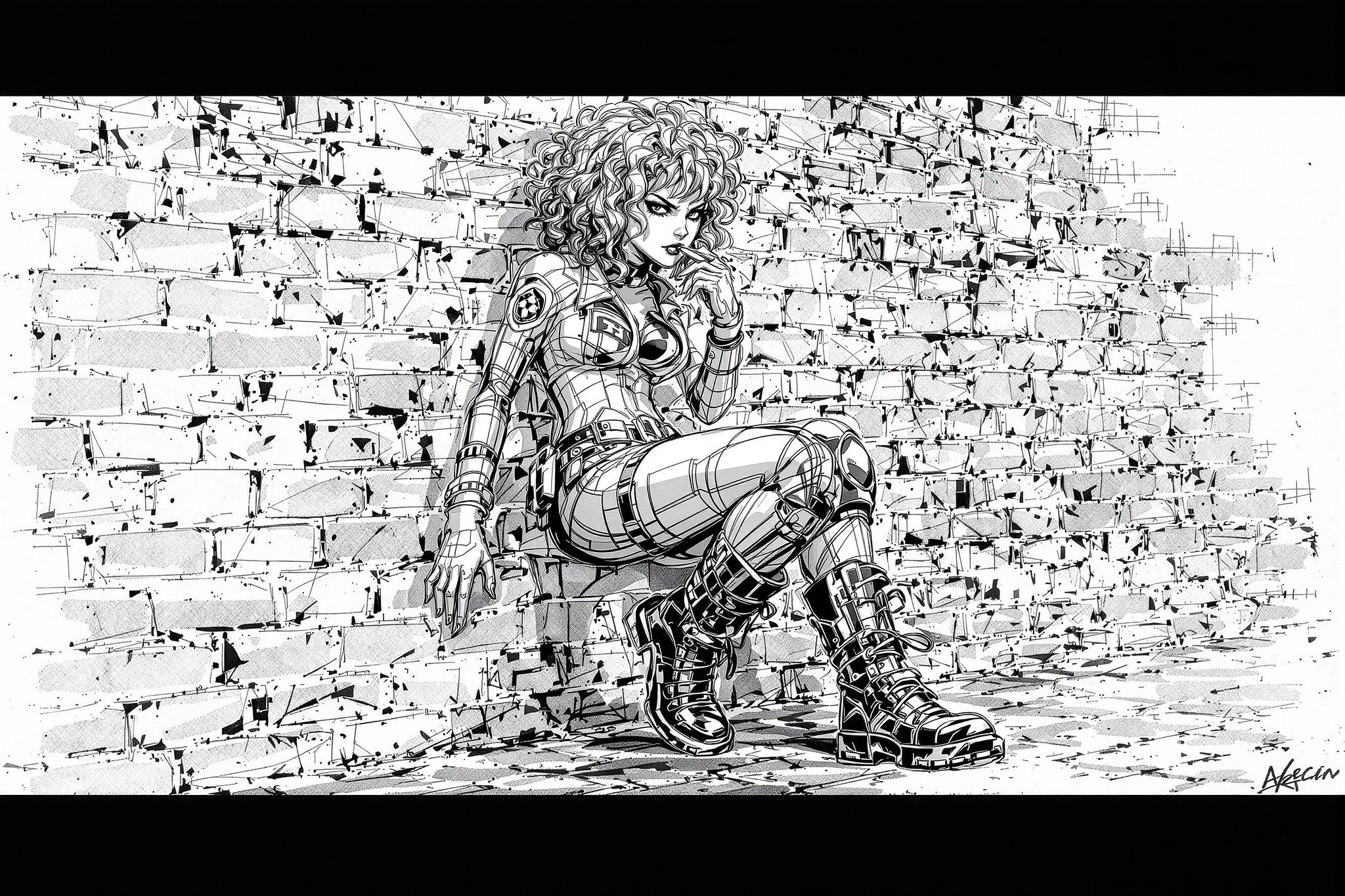 A very well done pencil sketch of a full body cyberpunk female character, around the age of 20 leaning against a brick wall smoking a cigarette and looking away from the camera. They have an angry face. They should be wearing a police outfit and heavy boots and their hair is reminiscent of makima from Chainsaw man, but curly hair. like malin akerman as laurie jupiter
