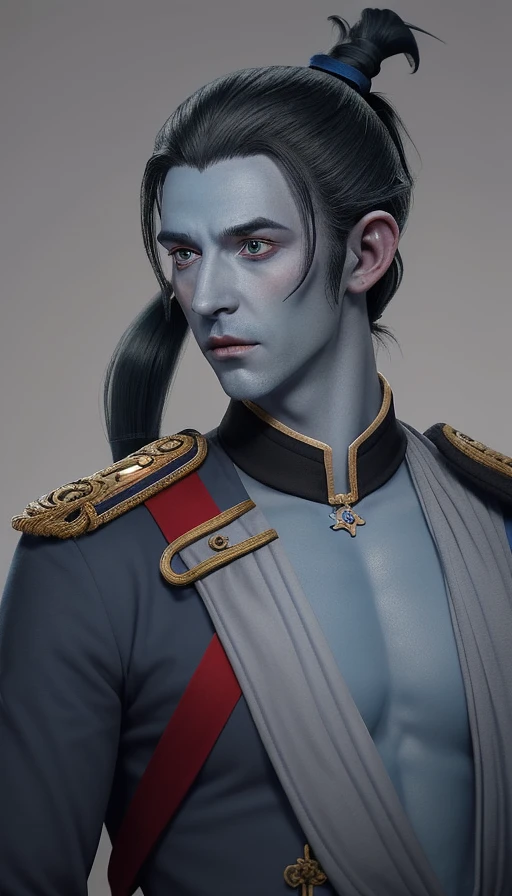 male tiefling with dappled blue-grey skin. Tall and slim with a distinguished van dyke. His black ponytail shows streaks of grey, and two small horns peek through above his temples. He is wearing a red period naval uniform with no hat and wields an ornate rapier in one handed and a slim yet sturdy arcane shillelagh in the other.