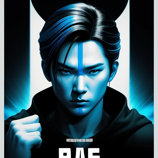movie poster, male character in black, white and blue, in the style of yoh nagao, light-focused --ar 71:128 --stylize 750 --v 6