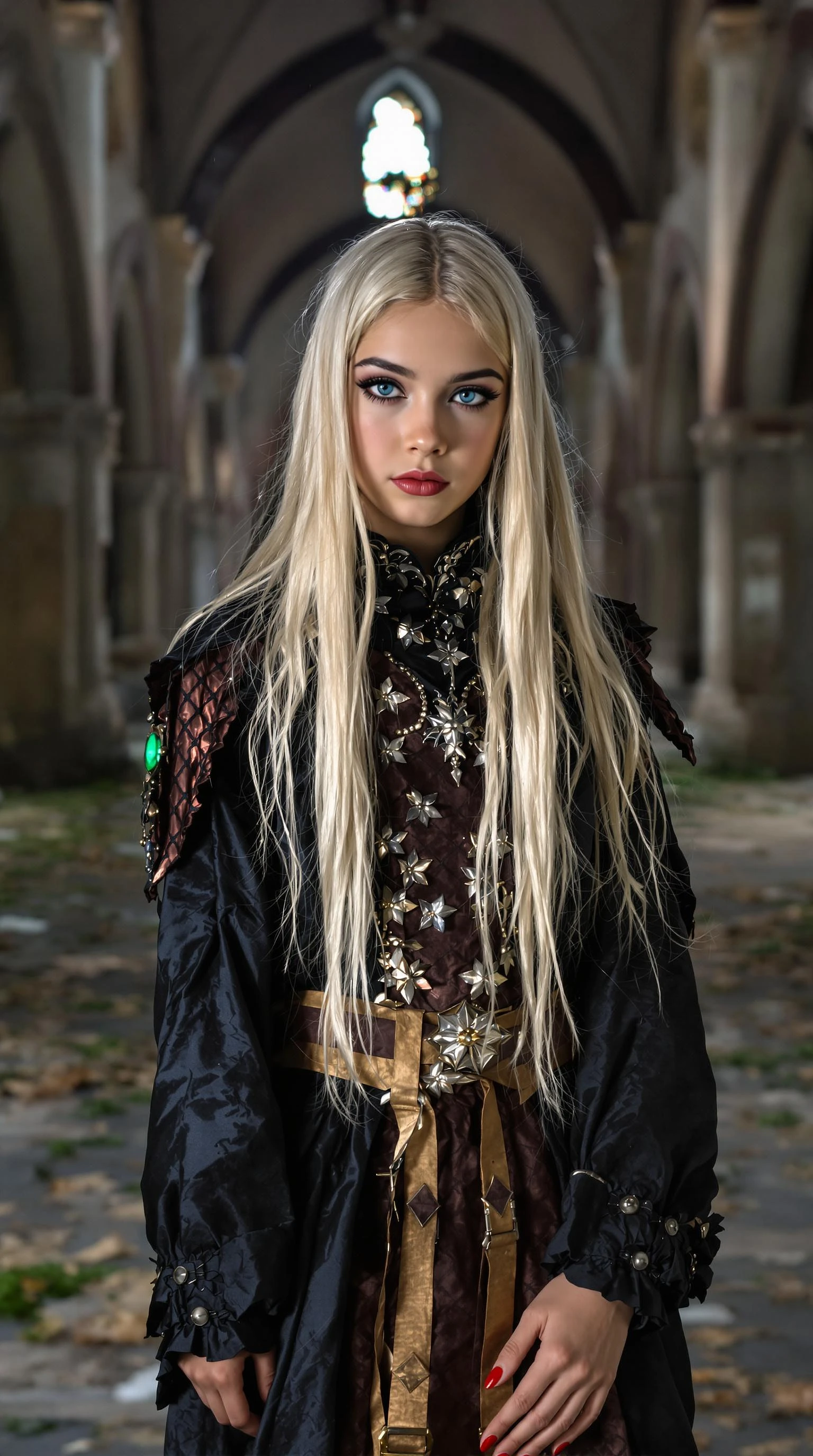 a professional photo of a exceptionally beautiful in the world, Preacher the vampire hunter (age 11) , (eleven year old) in a highly detailed, futuristic, (futuristic) , (masterpiece) , (realistic) , (perfect by age anatomy) , (Full body) , (viewing from head to feet) with extremely long blonde hair, flawless medium olive skin, thick black eye liner, extra long eye lashes, light pink blush, extremely beautifully shaped lips with light pink lipstick, blue eye shadow, flawless olive skin, extremely detailed large beautiful brilliant Forest Tea blue-brown-golden-grey eyes, beautifully manicured fingernail with red polish, (dressed in the style of a in a 15th century vampire hunter) , (standing in a 15th century abandoned church ) , high depth of field, gentle expression, 8k, (high res) , ultra-detailed, photo-realistic, full image view, full body view, front view, highly detailed, volumetric, dramatic lighting