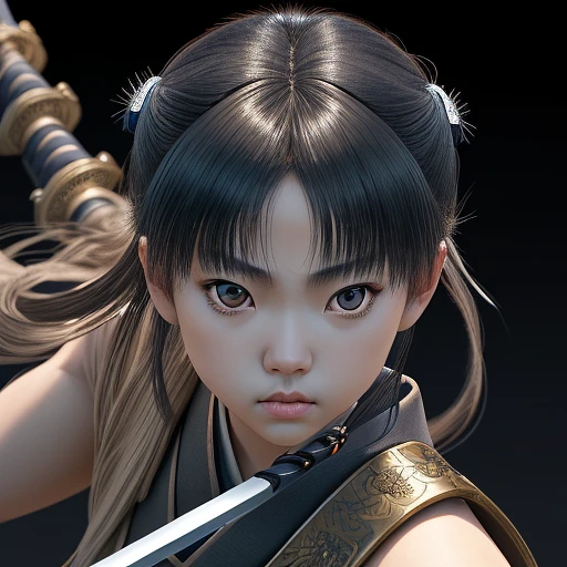 with black background, young samurai girl with saber and sword, in the style of realistic and hyper-detailed renderings, transfixing marine scenes, dolly kei, dark beige and navy, dragoncore, realistic figures, close up –ar 4:7 –niji 5 –style expressive –s 180