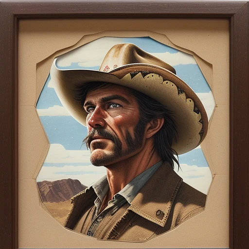 Very finely detailed 2-dimensional papar collage, featuring the face of a weatherworm western cowboy, close-up,
